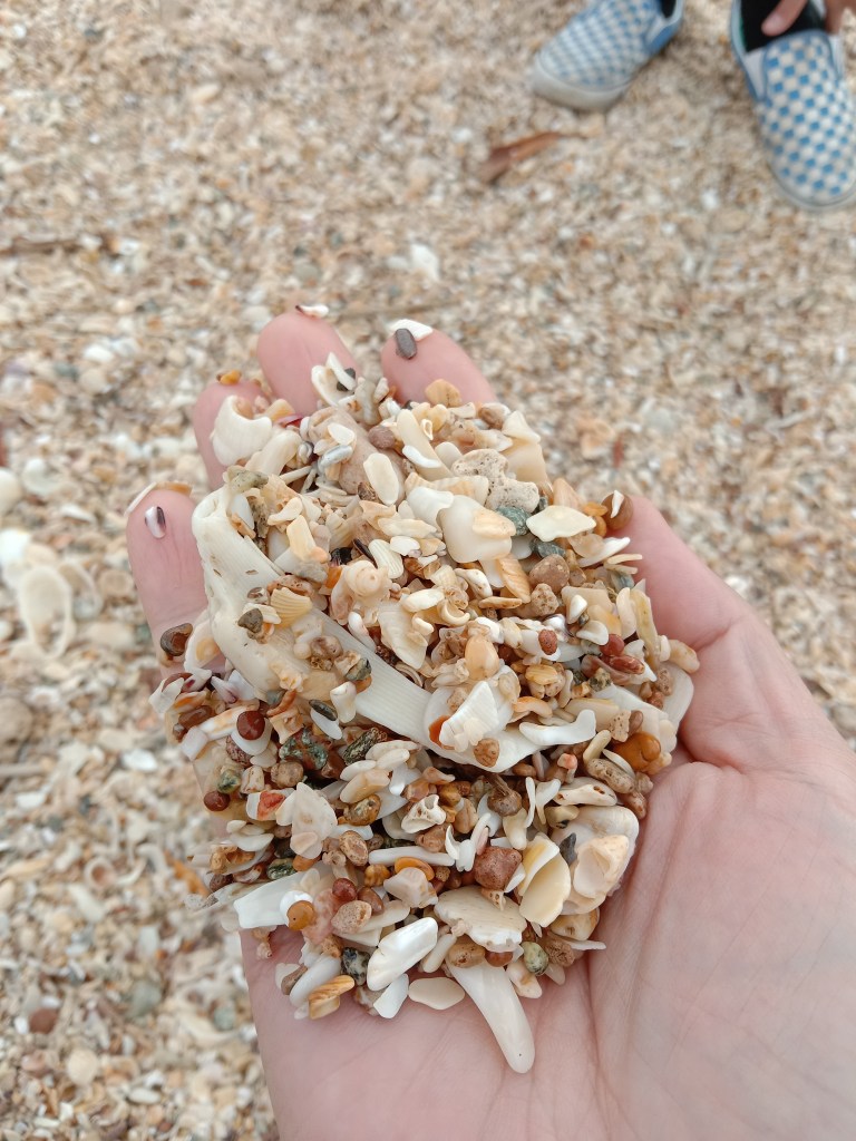 From afar it looks just like a normal beach. Unlike your typical sand grain, it comprises of small, broken seashells mixed with tiny pebbles.