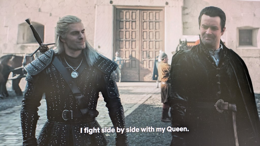 - S1E1 starts with the downfall of a kingdom. Queen and King dead, the princess was instructed to look for Geralt of Rivia aka The White Wolf aka The Witcher. Sad.